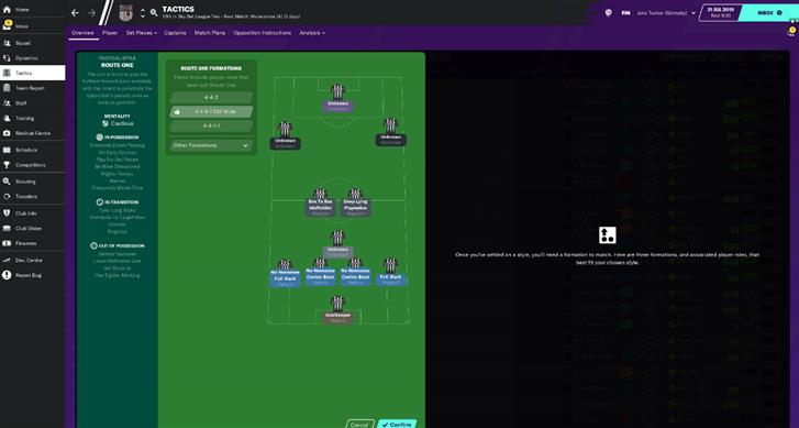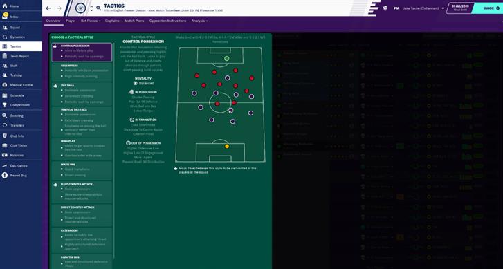 Visão global: A posse de controle está na escola de futebol “o que diz na lata”, na qual você procura dominar a posse e criar chances pacientemente. Se você quer que as coisas aconteçam imediatamente, essa não é a sua estratégia, mas combina com jogadores confortáveis com a bola, zagueiros e atacantes com uma mistura de habilidades.