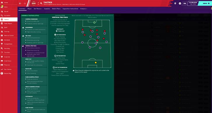 Visão global: Girando Tiki-Taka literalmente de lado, essa é uma abordagem muito mais direta, geralmente envolvendo jogar a bola para trás e para frente nas linhas inimigas. Pense nisso como o Tiki-Taka Extreme, na medida em que requer atributos semelhantes para fazer essa tática funcionar, mas também jogadores com ritmo e aceleração fracos para correr a bola para frente e para trás após a oposição.