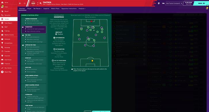 Visão global: Este pode ser um pouco mais complicado. Gegenpress, grosso modo, se traduz em “contra-imprensa” e a idéia é que você jogue no intervalo, recuando com força sempre que tiver oportunidade, ganhando a bola em campo e constantemente perseguindo a equipe adversária para obter o máximo de vantagem possível.