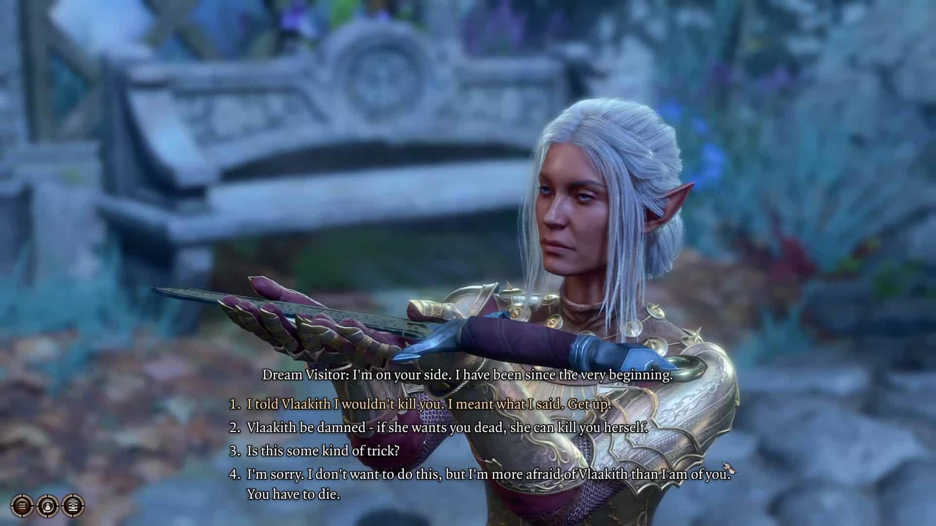 Auf diese Weise verlierst du auch das Vertrauen deines Vormunds, wirst zum Gedankenschinder und erreichst ein schlimmes Ende. Wenn Sie den Traumbesucher jedoch verschonen, wird er Ihnen mehr über den Illithidenparasiten und Vlaakiths Pläne erzählen. Verschone ihr Leben und kehre zur Krippe zurück. Kommunizieren Sie telepathisch mit Lae’zel und teilen Sie ihr alles mit.