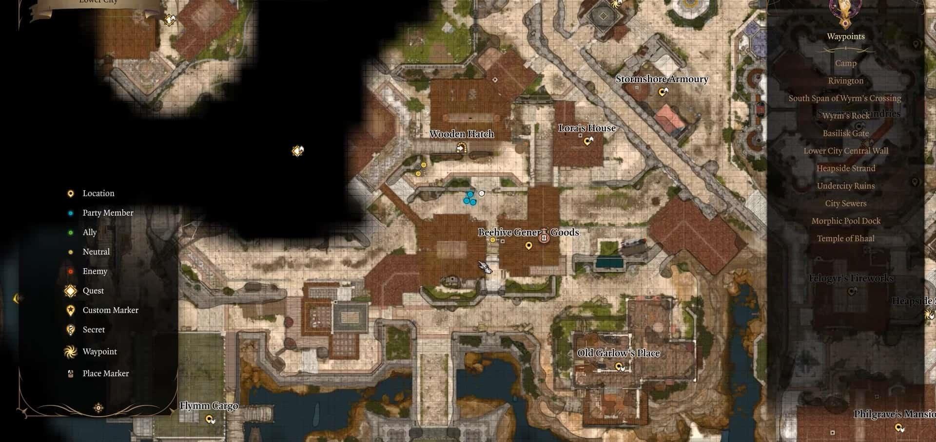 Der nächste Teil, das abgetrennte Bein, liegt im unteren Stadtbereich.Reisen Sie schnell zum Wegpunkt der zentralen Mauer der Unterstadt und gehen Sie von dort nach Westen. Gehen Sie zu dem auf der Karte markierten Haus und öffnen Sie die verschlossene Luke (X: -79, Y: -74). Verwenden Sie einen Dietrich und würfeln Sie über 15, um es erfolgreich zu öffnen.