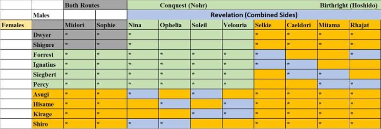 Quelques changements ont été apportés au système, et alors que l’enfant conçu dépendait de la mère dans Fire Emblem : Awakening ; le contraire est vrai dans Fates. Au lieu de cela, les enfants conçus dépendent du père, la mère fournissant la couleur des cheveux. Ce changement exclut tous les enfants ou Corrin et Azura.