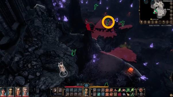 Je moet het Fort in BG3 Underdark naderen om bij de Icy Helve te komen. Ga nu het fort uit en ga bij de noordelijke poort van het fort staan; je vindt een klein pad aan je rechterkant waar je op kunt springen. Neem dit pad en vernietig de oranje paddenstoelen totdat je een paar bevroren Drows vindt. De locatie van de Drows in Baldur’s Gate 3 wordt op de kaart aangegeven met een gele cirkel.