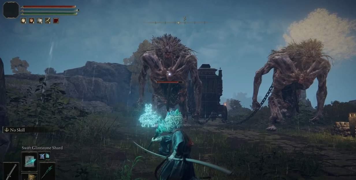 Idąc ścieżką trafisz na pomieszczenie z szarą ścianą z mgły. Musisz użyć Klucza do Kamiennego Miecza, aby zabrać kilka opcjonalnych przedmiotów. Po wyjściu z pomieszczenia znajdziesz dwa ogry. Jeden będzie spał, a drugi będzie strzegł dwóch łuków. Możesz zabić ich obu, jeśli chcesz tylko trochę dodatkowych Run.