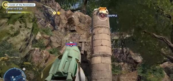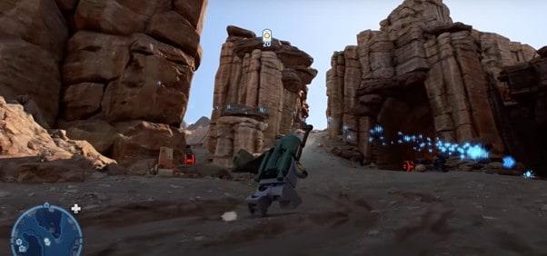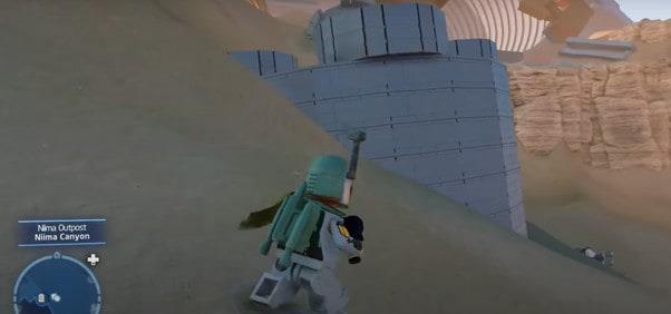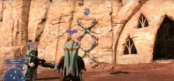 Następna lokacja, Lego Star Wars The Skywalker Saga Datacards, znajduje się w ulu Stalgasin na planecie Geonosis. Po pojawieniu się w ogólnym obszarze kanionów, chcesz dostać się do zaczepu znajdującego się w budynku przed tobą.