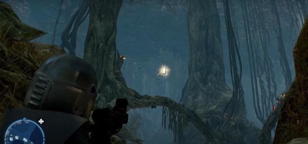 Musisz udać się do maleńkiej wnęki w południowo-wschodniej części mapy, aby zdobyć kartę danych na Bagnisku Smoczego Węża w Dagobah.Gdy już tam dotrzesz, zobaczenie karty danych umieszczonej wysoko na zakrzywionej gałęzi drzewa będzie proste. Możesz go zabrać, używając pomarańczowych uchwytów Lego, aby wspiąć się na gałąź.