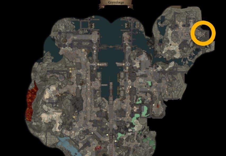 Po rozmowie z górnikami i strażnikami w pobliżu zapadliska musisz znaleźć Philomeen w BG3. Znajduje się ona w północno-wschodniej części Grymforge i pokazuje ją powyższa mapa. Aby się do niej dostać, będziesz musiał skorzystać z szybkiej podróży do punktu nawigacyjnego Underdark-Grymforge. Stąd skieruj się na wschód i skorzystaj ze schodów.