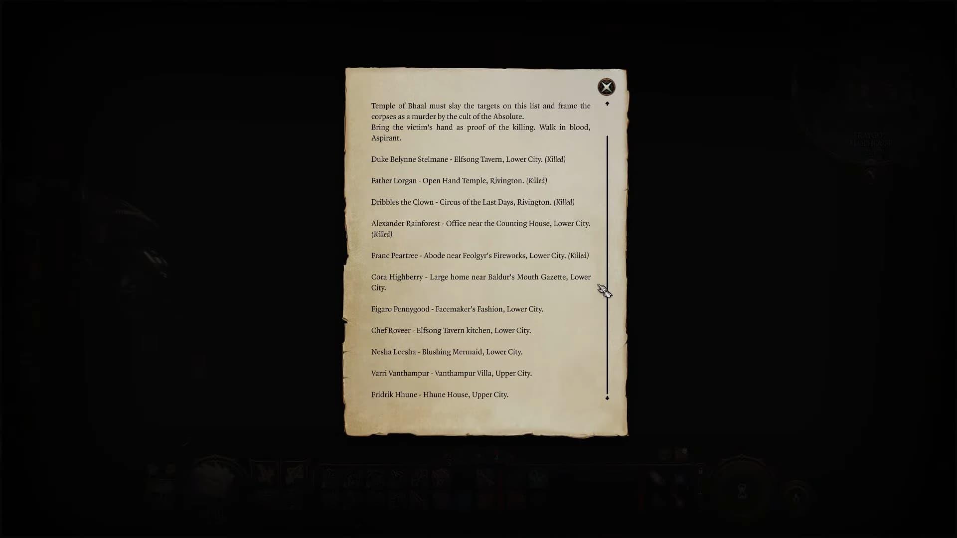 Śledztwo zaprowadzi cię do podziemnych tuneli, w których znajdziesz Flowery Key. Ten klucz otwiera zupełnie nową puszkę Pandory, która rzuca imprezę w spiralę spisku. Gdy użyjesz klucza, aby uzyskać dostęp do ukrytego pokoju w Flophouse Fraygo, jest Zakrwawiony pergamin zawierający listę osób już zabitych oraz listę dalszych ofiar. Rozpoczyna się zadanie Investigate the Murders w Baldur’s Gate 3.