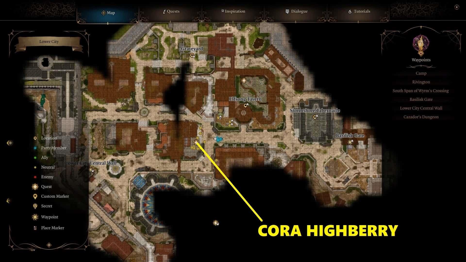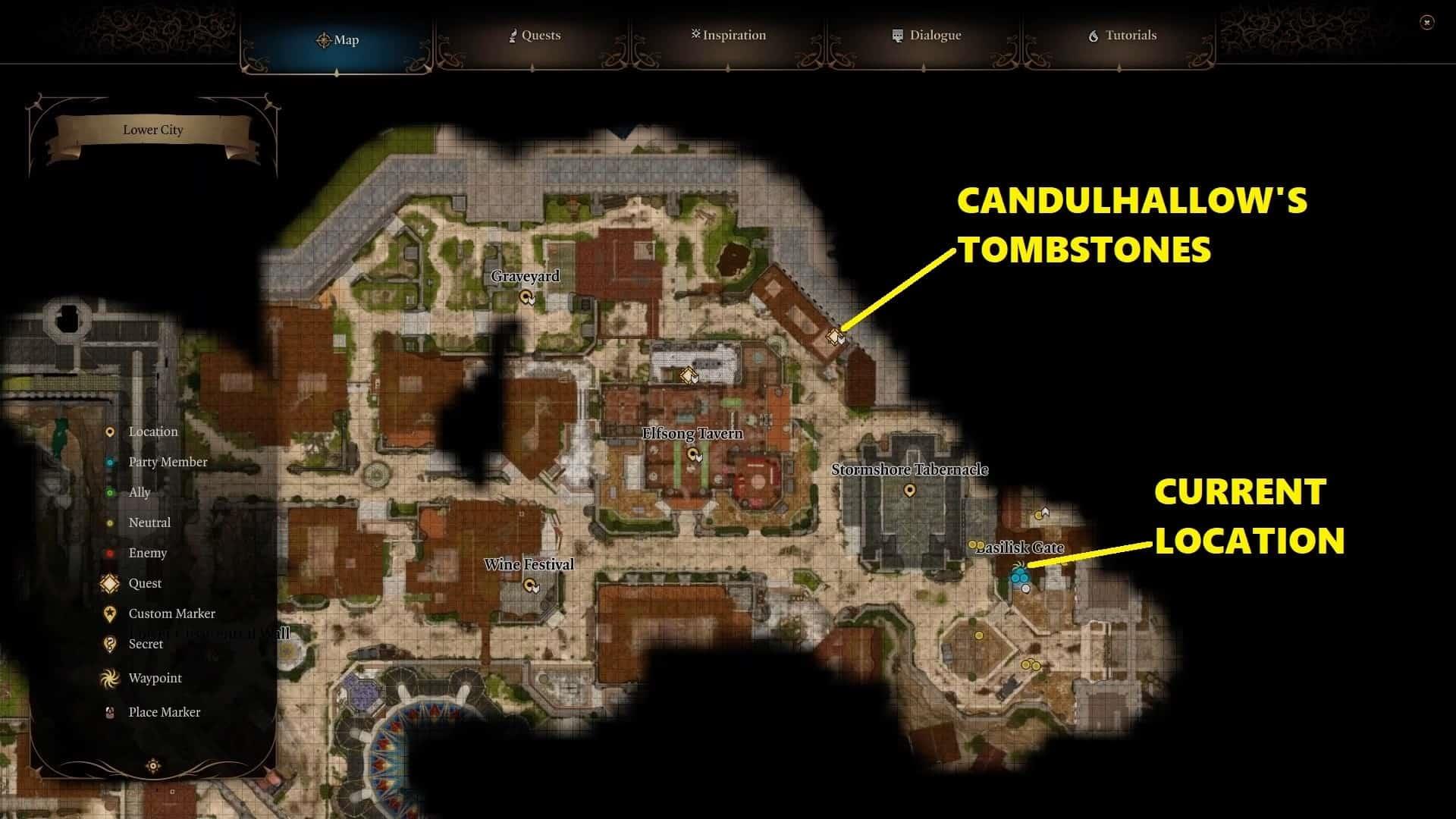 Wejście do Candulhallow Tombstones znajduje się na wschód od tawerny Elfsong. Szybka podróż do Brama Bazyliszka a następnie udaj się na północ, aby znaleźć zaznaczoną na mapie zamkniętą bramę (X: 73, Y: 21). Użyj klucza do nagrobka, aby wejść do obszaru, aby kontynuować śledztwo w sprawie morderstw w BG3.