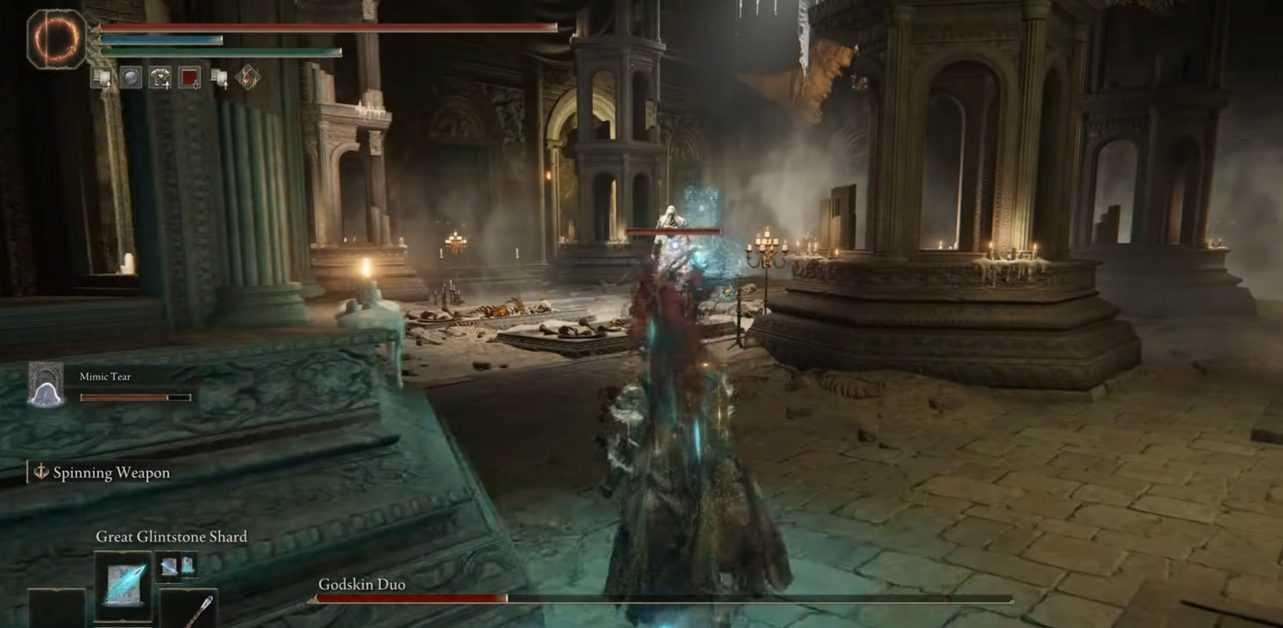 Ilekroć zobaczysz zwiotczałego bossa przechodzącego na bok, zacznij biec lub chowaj się za jednym z filarów, aby przełamać linię ataku. Atak cię powali, a Godskin Apostle wykorzysta tę okazję, więc unikanie tych ataków jest kluczowe.