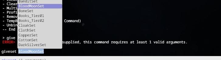 Jest jeszcze jedna ciekawa komenda, której możesz użyć, aby zdobyć określone zestawy zbroi i broni w grze. Rodzaj Giveset polecenie i naciśnij spację, aby uzyskać listę zestawów, których możesz użyć. Gdy wciśniesz Enter, te zestawy zostaną automatycznie dodane do twojego ekwipunku.