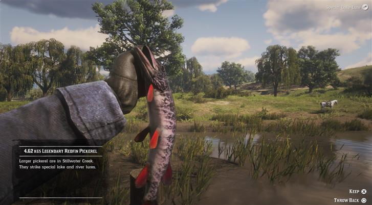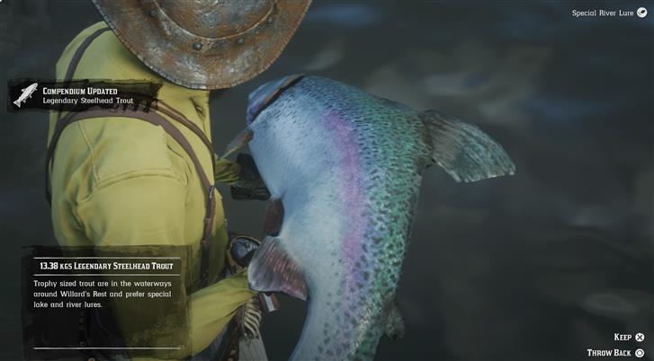 Diese legendäre Forelle ist gigantisch und die Herausforderung, sie einzufangen, stimmt mit ihrer Größe überein. Die Ufer sind nicht lukrativ, also musst du dich auf den Weg zu einer der Inseln im Fluss machen. Nachdem wir den Steelhead gefangen hatten, haben wir ihn leider im Wasser verloren, da wir unser Pferd nicht nah genug heranholen konnten. Zum Glück schwebte es flussabwärts und landete am Ufer. Denken Sie daran, wenn Sie es fangen.
